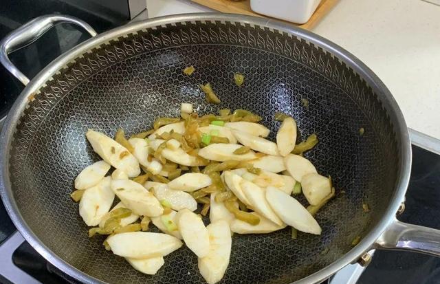 2、起锅烧油,放入榨菜和葱头,中小火翻炒出榨菜的香味,再放入山药,略微翻炒3-5下。